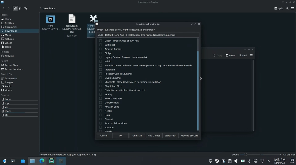 NonSteamLaunchers.desktopfile (or follow the terminal command provided in the repo description). - Execute the file on your desktop. If prompted, click Continue.