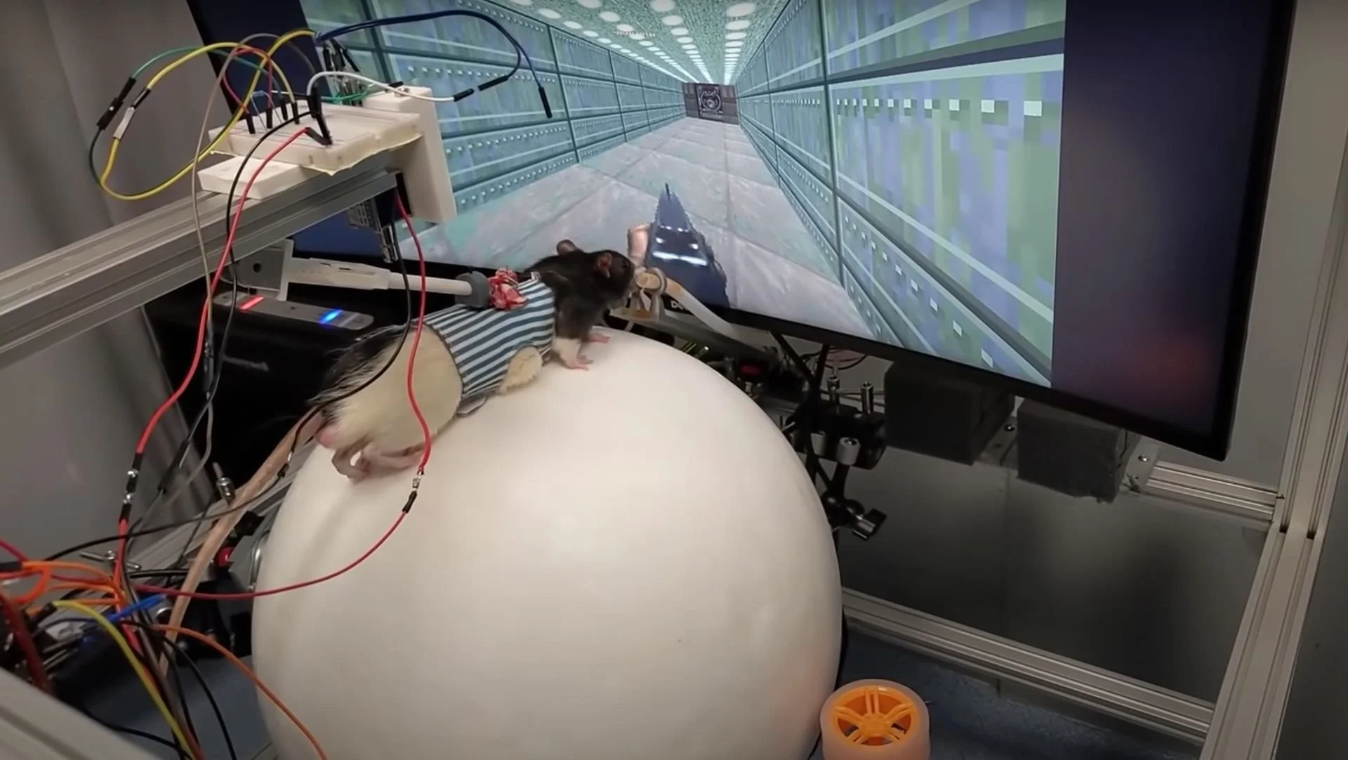 Toth placed the rodent on a spherical treadmill and linked its physical movements to the in-game character. The rat navigates the virtual corridors and is rewarded with sugar water from a solenoid dispenser for successful behaviour.